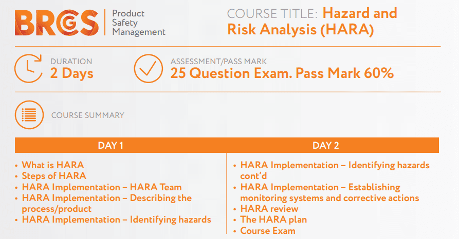 - By attending this two-day course, you will gain the essential knowledge of the hazard analysis and risk assessment principles using exercises and activities to demonstrate the preparatory stages to the development of a HARA plan.